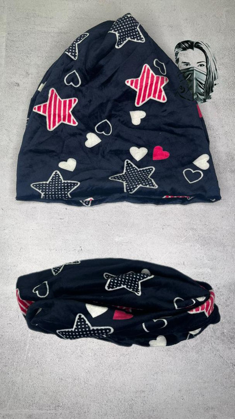 اسکارف کلاهی مخملی طرح ستاره و قلب | کلاه و اسکارف دوکاره گرم و نرم زمستانی